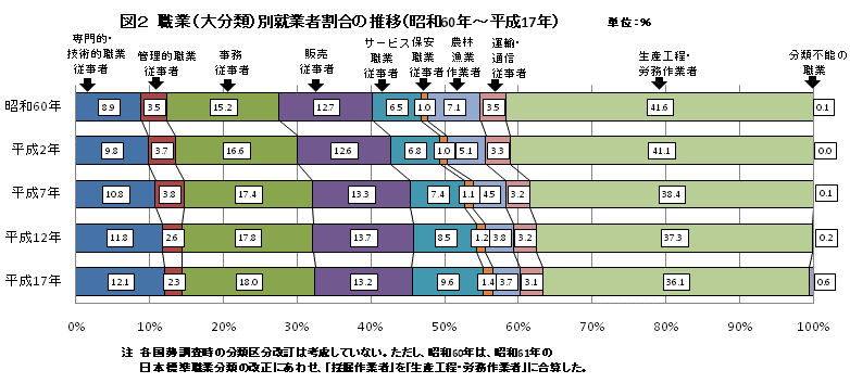 - 前回調査(平成12年)と比べると、「サービス職業従事者」が1万76人(10.8%)の大幅増、「生産工程・労務作業者」が2万1063人(5.2%)減などとなっている。「生産工程・労務作業者」の15歳以上就業者に占める割合は、国勢調査のたびに低下を続けている。