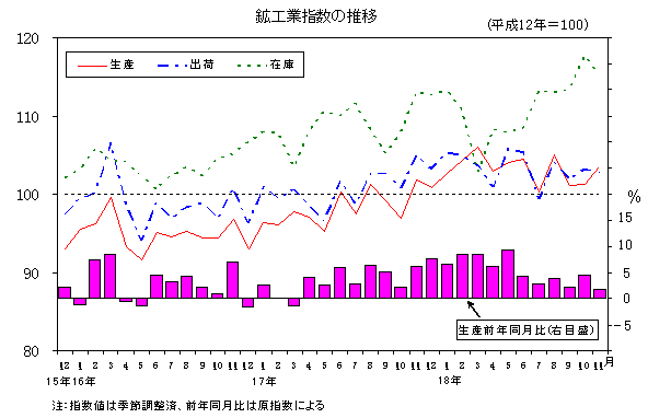 平成18年11月の県内鉱工業の動向を季節調整済指数でみると、食料品・たばこ工業、金属製品工業等が低下したものの、一般機械工業、窯業・土石製品工業等が上昇したため、前月に比べ生産指数は2.2%増と前月に引き続き上昇した。また、出荷指数は0.5%減、在庫指数は2.0%減と、ともに低下に転じた。