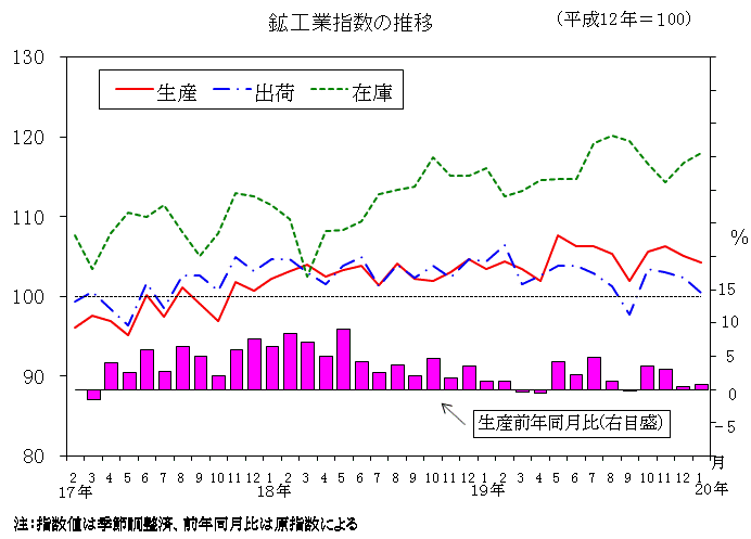 平成20年1月の県内鉱工業の動向を季節調整済指数でみると、金属製品工業、その他工業等が上昇したものの、一般機械工業、電気機械工業等が低下したため、前月に比べ生産指数は0.8%減と前月に引き続き低下した。また、出荷指数は1.8%減と3カ月連続で低下し、在庫指数は1.0%増と前月に引き続き上昇した。