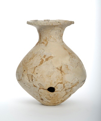 方形周溝墓(SZ175)の北側周溝から、別の壺と並んで横向きの状態で出土した壺です。方形周溝墓に供えられた供献(きょうけん)土器と考えられ、胴部には意図的に孔が開けられています。口縁部が大きく開き、胴部の形がそろばん玉のような形をしているのが特徴的です。