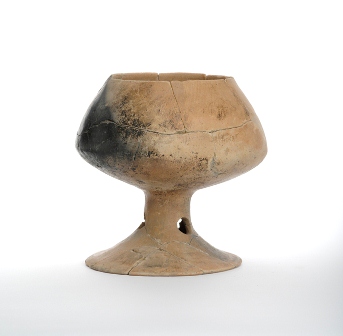 遺跡東部を南北に流れる大溝の埋土中層から出土した高坏です。高坏にはいろいろな形をしたものがありますが、これはその形状が似ていることから「ワイングラス型」と呼ばれているものです。写真では左の方が黒く変色しているように見えますが、それは焼成時に何らかの要因で残った黒斑(こくはん)と呼ばれるものです。