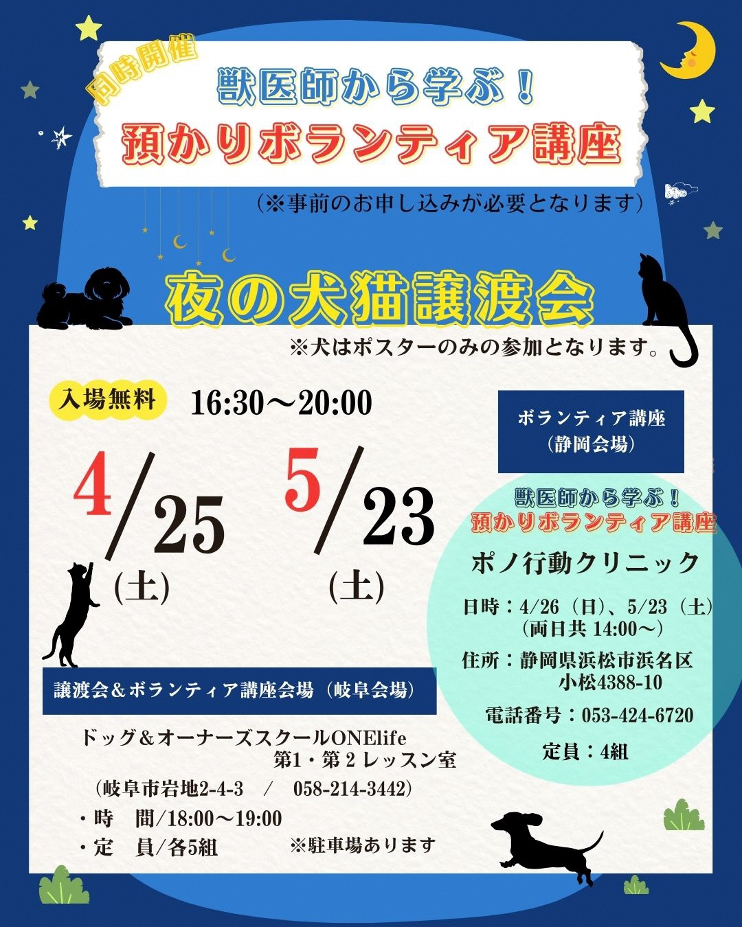 | 猫 | 4月25日土曜日 5月23日土曜日 16時30分から20時 |