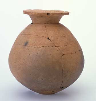 土坑墓から出土した広口壺です。弥生時代末期のものと考えられます。口縁部外面には深い2条の横線が巡り、内面には羽状の列点が入っています。また胴部には横線と波状文が入り、不定方向のミガキが施されています。