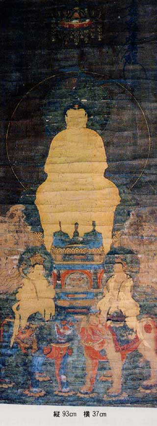 釈迦三尊の仏画の由来は不明であるが、天台宗時代から伝承されたものとは考えられない。仏画も元来拝するためのものであるが、仏教美術として鑑賞すれば、これは室町時代のよき作品である。かつて掛け放しにしたために、彩色も剥落し、褪色し絹も疲れている。江戸時代に細心な修補加筆をしている。中尊釈迦如来の面容は、原本より甘く描かれていると思われるのは修補加筆によるものであろう。色彩は全体として鮮明で優美である。構図は原本によるものであるが、主尊が大きく、下部向かって右の普賢菩薩、左の文殊菩薩とも小さく描いている。諸尊の相好は円満で、全体に麗美で優雅な截金または繧繝彩色文様、暈染染色の巧妙な手法は伝統の仏画描法通有の特色がある。