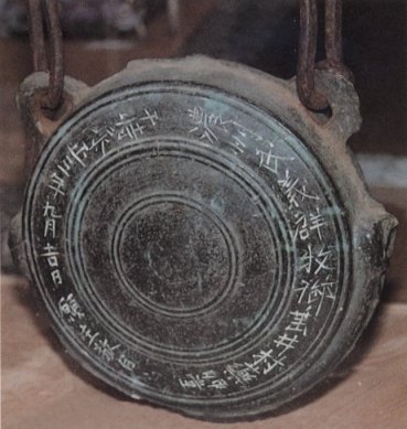 鋳銅製で面径21.0cm、厚さ7.5cm、耳の出3.0cm、唇の出1.7cmである。撞座は素文になっている。表面外圏に次の銘文がある。