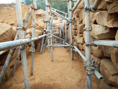 石室の側壁では、横目地(よこめぢ)を観察することができました。その結果、下から順に最大で9段階に分けて石材を積んだことがわかりました(左写真)。側壁の石材を上から順に取り除いていくと、最下段の石材が、内側が直線状になるように並べられていました(右写真)。