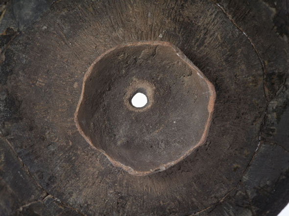 SD17下層から出土したS字状口縁台付甕です。口縁部から体部内外面に煤が付着しています。台部は意図的に打ち欠かれており、底部に直径8mmの穿孔があります。