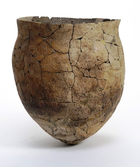 土器埋設遺構で使用されていた縄文土器の深鉢です。外面に煤が付いていることから、煮炊きに使用した土器を転用したと考えられます。2つの土器が口を合わせた状態で出土し、土器の中には石が入れられていました。
