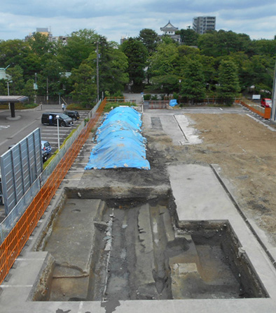 大垣城跡・城下町は、揖斐川が運ぶ土砂によって形成された扇状地に所在し、発掘区は現在の大垣城跡天守から約200m西に位置しています。発掘調査によって、中世から近代にかけての遺構・遺物を確認しました。上の写真の中央は、近代の大溝(上幅5m40cm・深さ1m20cm)です。