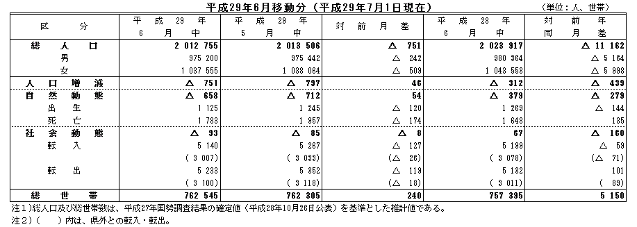 平成29年7月1日現在の本県の推計人口は、2,012,755人となり、前月に比べ751人減少しました。