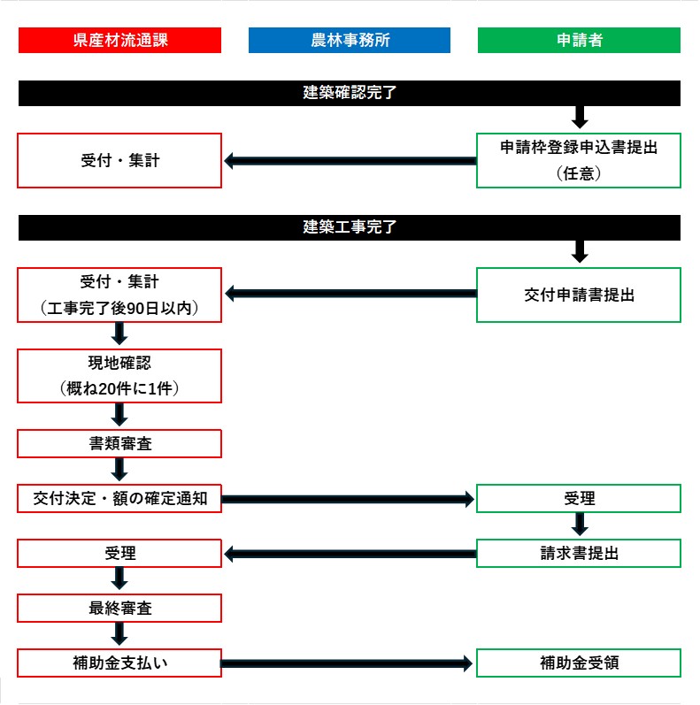 工事完了日から起算して90日以内に、県庁県産材流通課へ申請書類一式を提出してください。