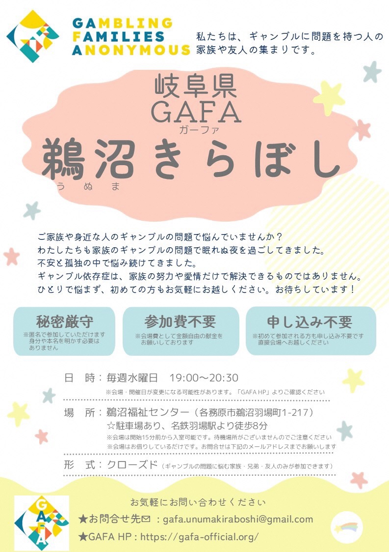 | 岐阜グループ | 開催日:毎月第1・3土曜日(月2回) 時間:午後2時から午後4時 場所:OKBふれあい会館(岐阜市薮田南5-14-53) 問合せ:info@gam-anon.jp |