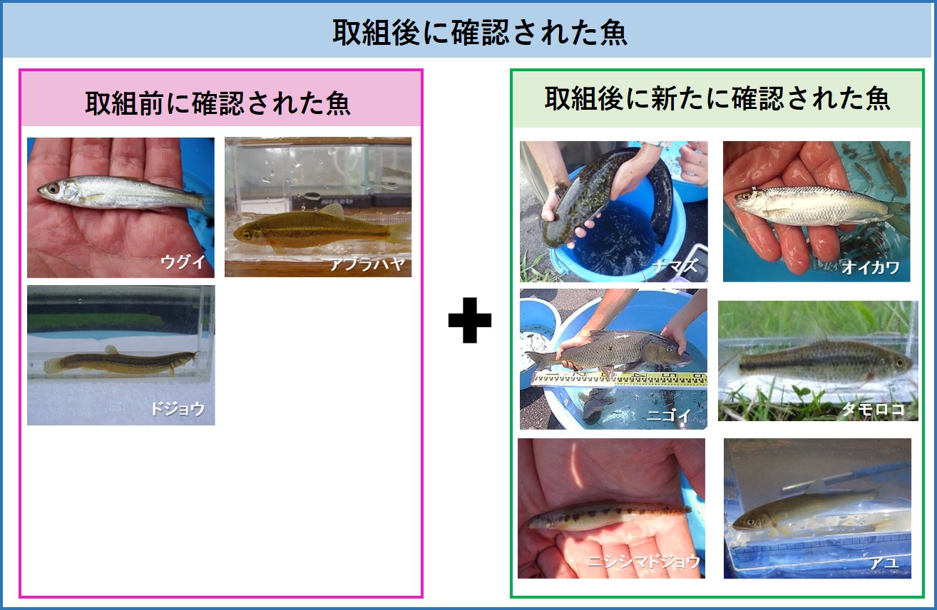 落差解消前は3種類の魚が確認されていましたが、落差解消後は8種類の魚が確認されています。