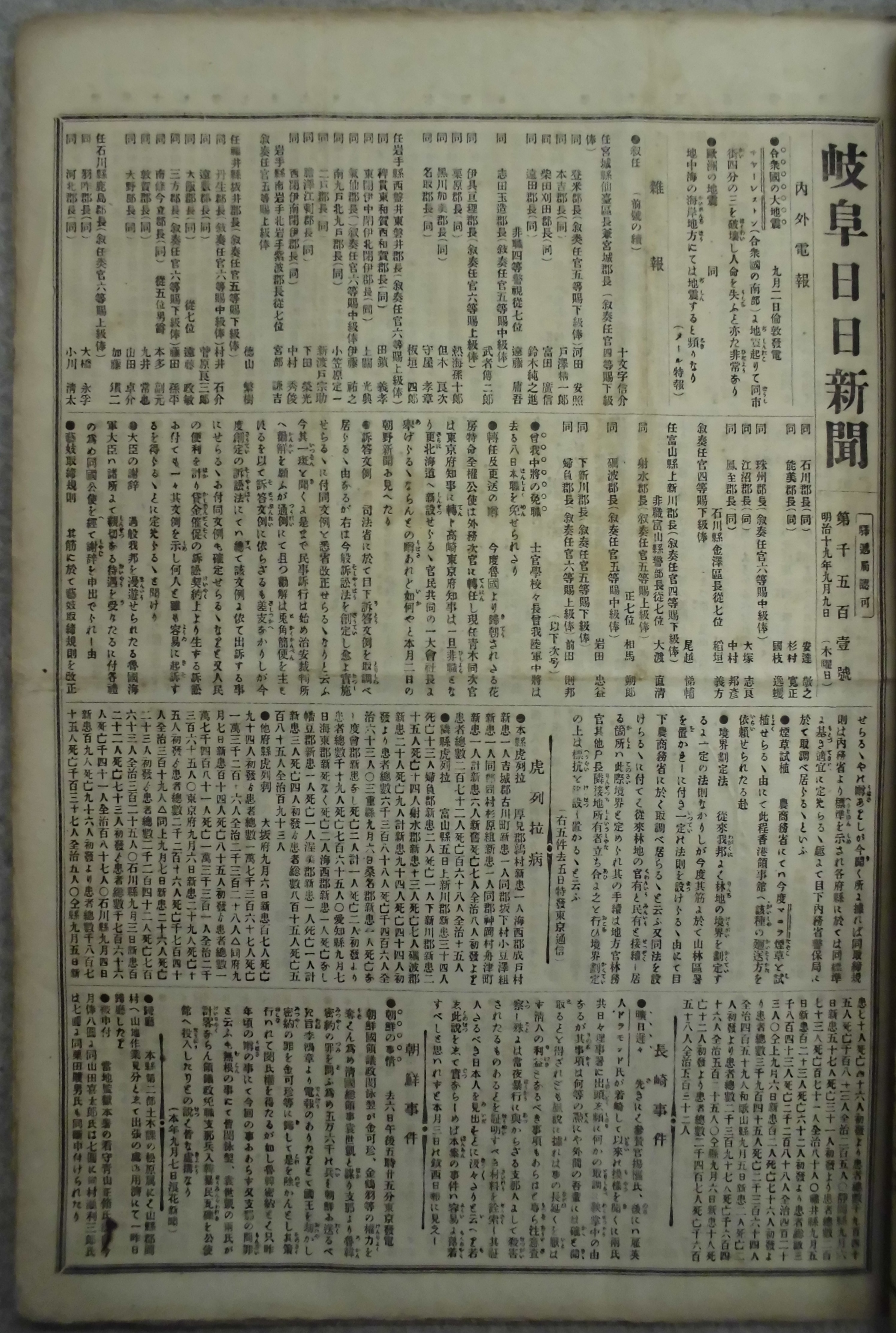 岐阜日日新聞の綴り。第1494号(明治19年9月1日発行)から第1518号(明治19年9月30日発行)まで。
