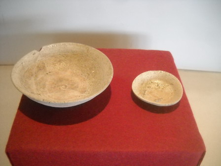 山茶碗は、無釉の陶器で、中世の頃に東海地方を中心に広く普及した食器です。碗は、飯用の食器で、小皿にはおかずや調味料を入れたとされています。北方京水遺跡、興福地遺跡をはじめ大垣市内の遺跡でも多く出土しています。