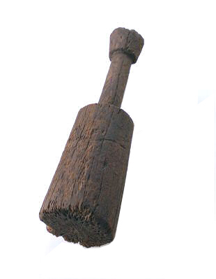 幅約20m・深さ約0.9mの自然流路跡から出土した、横槌(よこづち)です。円筒形の打つ部分に細い柄が着き、全体が一木で作り出されています。柄の先端と打つ部分の一部が薄く剥がれています。打つ部分の正面にはほぼ同じ方向に、同じ長さの刃物の痕が多く残っています。