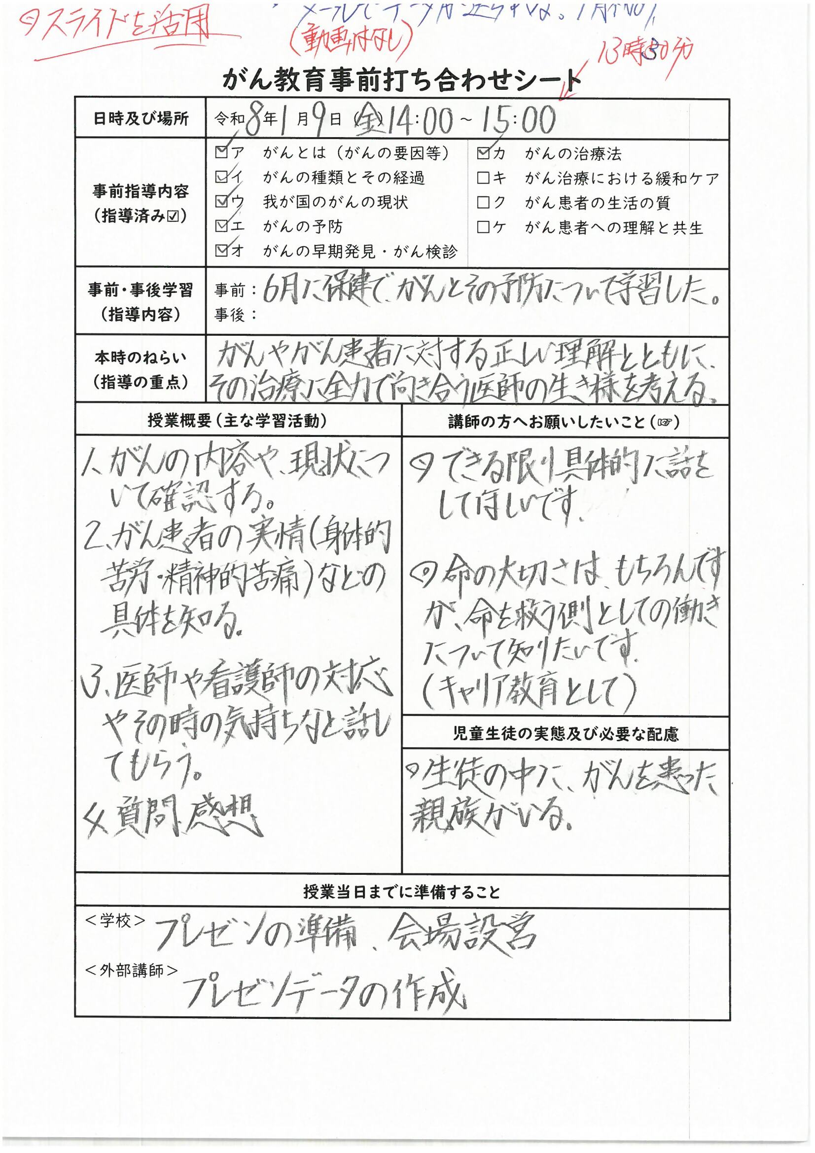 推進指定校が作成・使用した外部講師との事前打合せシートや学習指導案等の資料を掲載しましたので、がん教育推進の参考にしてください。
