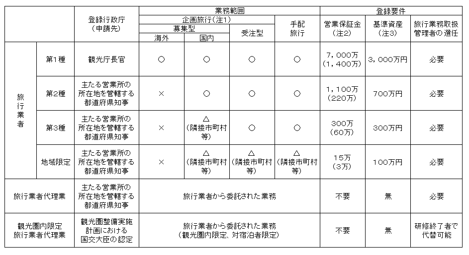旅行業登録には、取り扱うことができる業務範囲に従い、以下の種別があります。