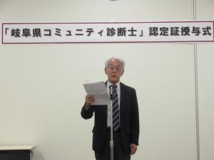 このたび、認定試験に合格し、新たにコミュニティ診断士として認定される7名の方々に、西千代美県環境生活部次長、平手賢治岐阜協立大学副学長から認定証が授与され、第23期生を代表して、澤井道弘さんから今後の抱負を述べていただきました。