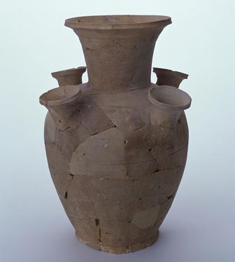 護摩を焚いたと推定される焼礫集積遺構付近から出土した、平安時代末期のものと思われる多口瓶です。ラッパ状に外反する主口頸部と肩部に4つの子口頸部を持つことが特徴的です。胴部は粘土紐巻き上げ技法によって製作され、胴部下半にはロクロ痕、ヘラ削りの跡が明確に残っています。
