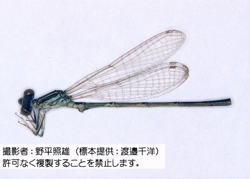 翅の長さ15mm前後のトンボである。体の色は雄は水色、雌は黄緑色で雌雄とも背側には黒条がある。腹長は22mm前後である。 |