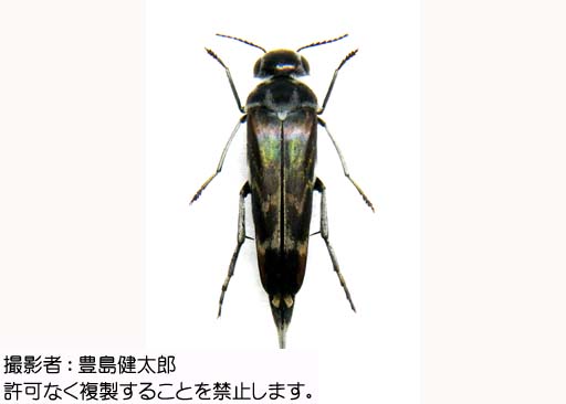 成虫は7〜9月に出現する。昼間、活発に飛び回り枯れ木や薪に集まる。幼虫は枯れ木の材内に穿孔しているが詳しいことはわかっていない。 |