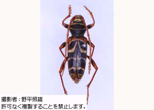 前胸は丸く膨らみ、背面は平坦である。翅は細長で、後方へ狭まる。触角は長く、オスは翅の端にまで達する。黒褐色の体に黄みを帯びた斑紋は、鮮やかである。 |