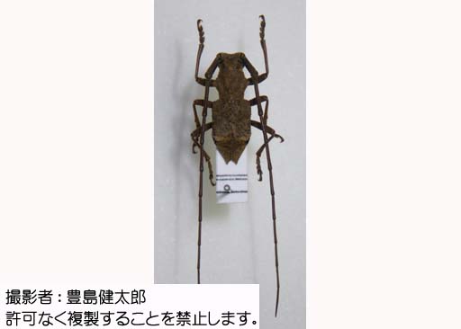 体長10〜22mmのカミキリムシ科甲虫である。褐色〜黒褐色で、後翅が退化し、飛ぶことができない。上翅は堅牢で、小顆粒を散布する。上翅の先端は矢筈状に尖る。 |