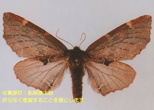 翅を広げた大きさ40〜43mm前後の蛾。翅の色は茶褐色。翅の縁がえぐれる。5〜7月に出現する。