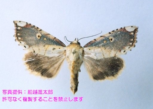 翅を広げた大きさ38〜40mm前後の蛾。翅の色は前翅は青味を帯びた黄緑色に黄や黒、赤褐色の斑紋を混ぜる。後翅は黄褐色で黒色の帯状斑紋がある。
