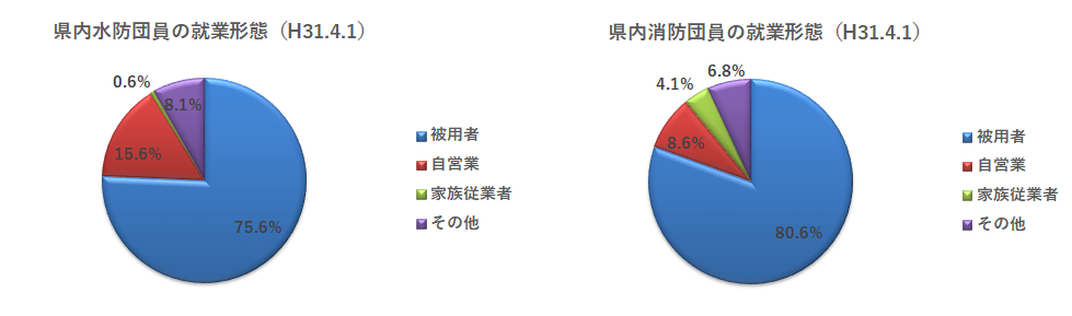 被用者(サラリーマン)の占める割合は水防団員の75.6%に対し、消防団員(兼任水防団員)は80.6%であり、水防団員の被用者の割合の方が低い。(平成31年4月1日現在)