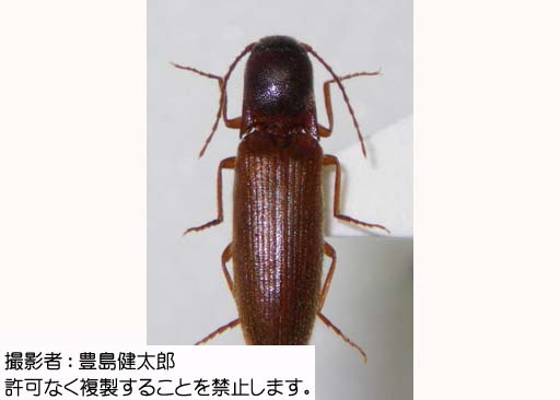 体長9〜11mmのコメツキムシ科甲虫である。茶色で、西日本に局地的に分布するウスカバイロコメツキに似ているが、色調はより薄い。 |