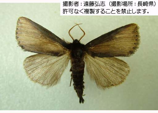 翅を広げた大きさは39mm前後の蛾である。濃茶褐色の地色に前翅前縁から後縁にかけて周りが黒くなる。後翅は一様に薄い褐色である。 |