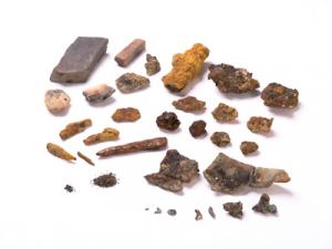 区画溝や周辺の遺構からは、大量の土師器皿の他、鞴羽口や砥石、清郷型鍋を転用した坩堝といった鍛冶に関する遺物が見つかりました。今回の発掘調区内において古代から中世にかけて、鍛冶を営んでいたと考えられ、鉄製品の鍛造だけでなく、銅製品の鋳造も行っていたことが明らかとなりました。