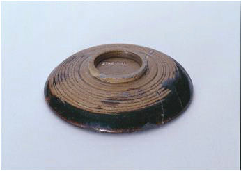 かえりはなく、輪状のつまみがあります。つまみ周辺から胴部中程まで鎧手(よろいで)の手法(溝が何重にも刻まれている)で装飾されています。鎧手とその周辺のみ錆釉が施釉され、他は鉄釉が施されています。