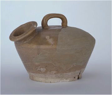 幅4.3m・深さ0.9mの堀と考えられる溝跡から出土した、近世後期に製作された陶器(連房)のしびんです。