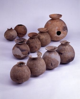 古墳時代前期のいわゆる柳ヶ坪型と言われる壺や口縁部が受口状となる壺です。器高が25cm前後から大きいもので48cmのものまであります。これらは遺跡東部を南北に流れる大溝(SDc031)の岸辺にまとまって廃棄されていました。