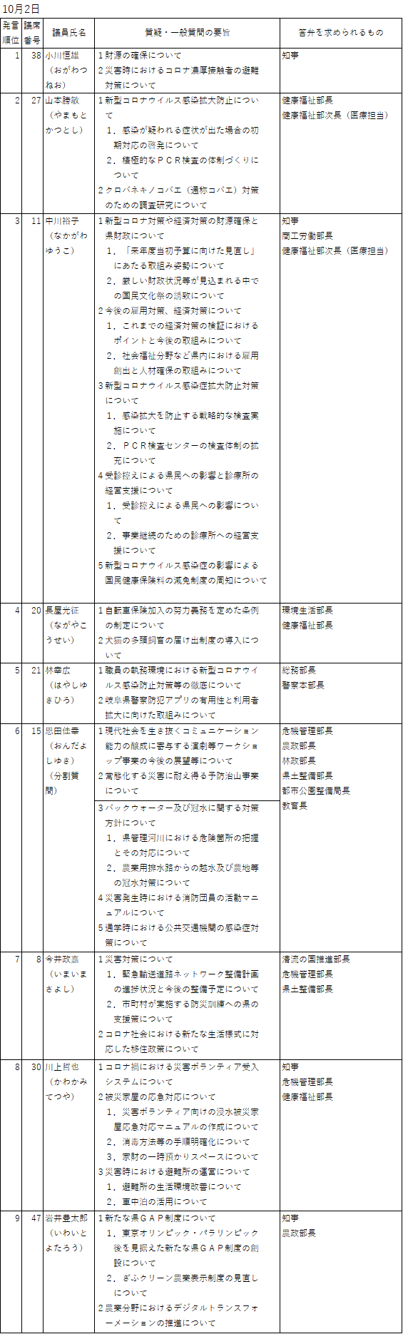 令和2年第4回岐阜県議会定例会の一般質問の予定を掲載しました。