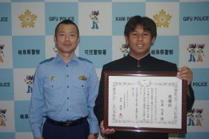 可児警察署は、男児の保護活動に功労があったとして、比嘉大喜さんに、署長感謝状を贈呈しました。