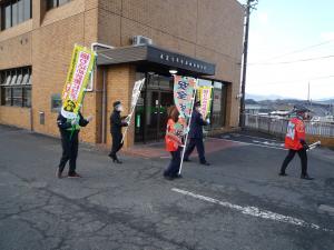 令和4年1月19日、中津川市内において、市役所職員を名乗る男から電話を受けた高齢女性が現金をだまし取られる還付金詐欺被害が発生しました。これを受けて、同年1月28日午後3時より、昨年末に当署で結成した「安全安心一座」を集結し、中津川金融機関防犯協議会とともに、金融機関周辺における被害防止の呼びかけを行いました。