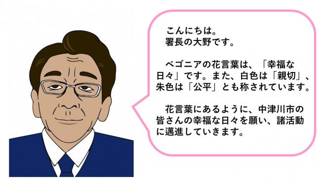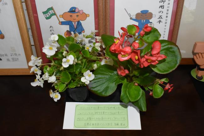 6月21日、加子母中学校において「少年の主張中津川大会」の審査で訪問させていただきました。行事が終了し中津川警察署に帰る際に、教職員の方から「生徒会執行部が育てたベゴニアです。」と白色と朱色のベゴニア2株を頂きました。