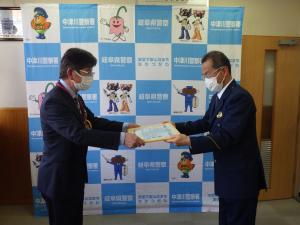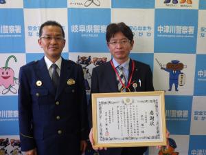 本年4月20日(木曜日)、中津川警察署の署長室において、窓口に来たお客様の詐欺被害を未然防止した川上郵便局の局長早川順一さんに対して、宮ノ腰警察署長から感謝状の贈呈を行いました。