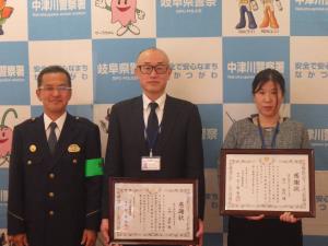 11月21日(火曜日)、中津川警察署において、来行したお客様の詐欺被害を未然防止した愛知銀行中津川支店の次長山中基裕さんと田口佳代さんに対して、宮ノ腰警察署長から感謝状の贈呈を行いました。