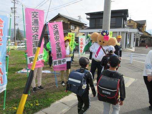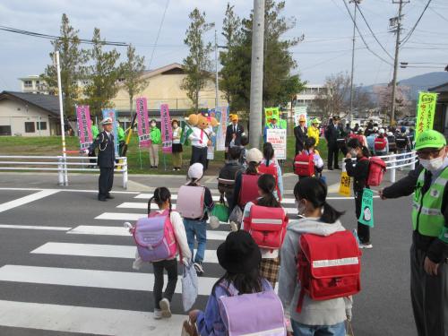 西小学校では、中津川市長や関係機関・団体の皆さまにも参加していただき、中津川警察署の人気マスコットキャラクター「たれみちゃん」も登場して、児童の登校を見守りました。